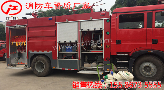 豪沃T5G江特牌JDF5190GXFGP70/Z干粉泡沫聯用消防車,軸距4700MM,MAN發動機340馬力,上戶噸位2立方干粉,2.8立方水,1.912立方泡沫。