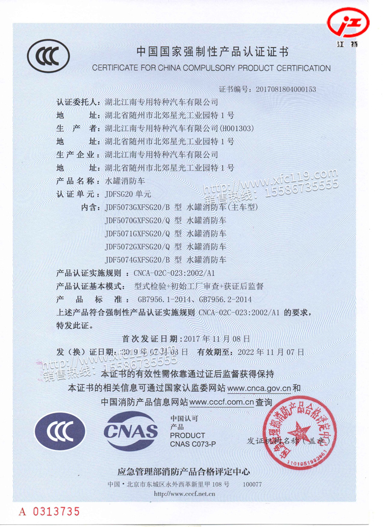 該款消防車車型為目前國內(nèi)最新的國五消防車,軸距3360mm,整車型號(hào)為JDF5074GXFSG20/B型水罐消防車,底盤采用福田BJ1073VEADA-C2改裝,采用該款底盤生產(chǎn)的消防車的公告目前我公司湖北江南專用特種汽車有限公司率先完全并下發(fā)。